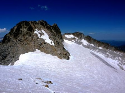 Ahora nos queda atravesar el último tramo del glaciar del Aneto por un trazado muy marcado por el transito habitual de montañeros que acceden por esta vertiente.