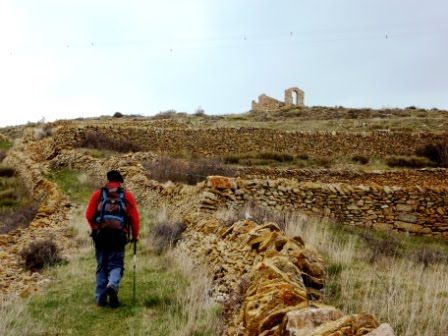 Situados frente al hotel, comenzamos a caminar por la izquierda, sobre el asfalto. En poco más de 100mts debemos salir de la carretera, desviándonos por la derecha junto a un panel de turismo de la población para ascender hasta la derruida ermita de San Antonio que vemos en lo más alto del cerro.