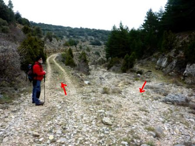 Seguimos de frente por su margen derecho para subir un pequeño montículo, giramos hacia la izquierda sin camino definido pero encontramos alguna fita. No hay pérdida porque en definitiva debemos bajar por la otra vertiente atravesando algunos bancales con muros de piedra seca para conectar con la pista que vemos delante y que nos llevará al inicio del barranco. Este punto (1) será común en la ruta, volviendo a pasar por aquí, una vez regresemos.