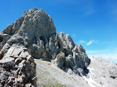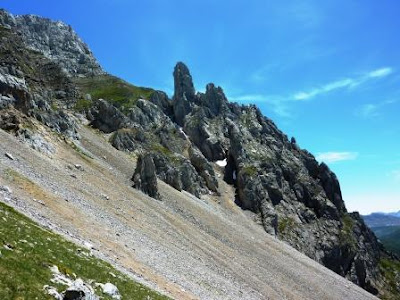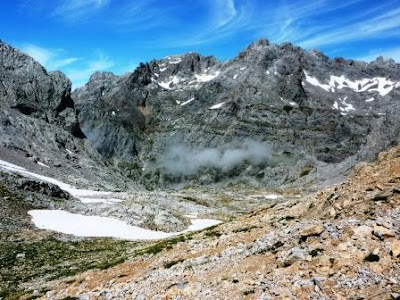 Siguen las nieblas y siguen desbaratándonos los planes. Esta vez decidimos probar suerte en el macizo Central ya que en la parte occidental de Picos, en Soto de Sajambre, donde nos alojamos no se pueden realizar rutas sin caminar a ciegas y en estos últimos días nos hemos tenido que desplazar a la zona de Riaño donde hemos hecho algunas rutas. Como digo probamos suerte en el cuadrante central y nos dirigimos a Posada de Valdeón, para realizar en un principio la ascensión a la Torre de Liordes con un track que bajé en Wikiloc. Una vez allí comprobamos que estaba despejado la parte a la que debíamos dirigirnos, los Picos de Friero. Nos pareció que el trazado era demasiado largo desde Posada, sin duda el que realizó esta ruta estaba muy en forma. Buscamos acortarla dirigiéndonos a la población de Santa Marina de Valdeón y hablando con un amable lugareño, nos indicó una forma mas corta de acercarnos a la zona en cuestión. Se trataba de seguir con el coche en dirección al puerto de Pandetrave y en una de las contracurvas cerradas de la carretera deberíamos aparcar el coche y comenzar a caminar.