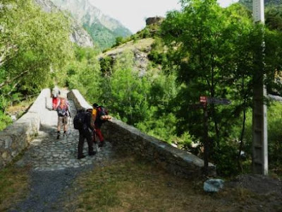 El iniciamos en el puente medieval de San Jaime, dentro del camping Aneto (Benasque). Aquí y justo antes de cruzar el puente, encontramos unas tablillas del GR11.