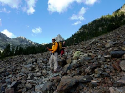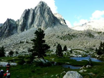 Ya con la Aguja muy cerca frente a nosotros y a la altura de unos pequeños ibones vemos la posibilidad de dejarnos caer por la formidable pedriza de la izquierda.