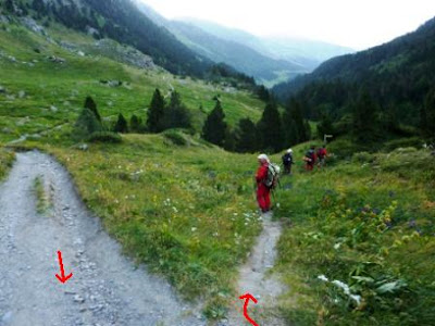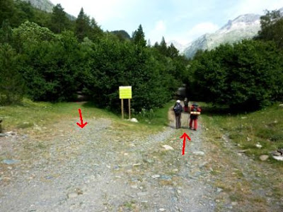 Giramos a la derecha siguiendo las indicaciones de un panel que nos recuerda por donde subir hasta el ibón superior, el Gran Batisielles. La senda toma fuerza en ascensión y atraviesa algunas pedrizas enfilándose en dirección a la inconfundible cumbre afilada de la Aguja de Perramó.