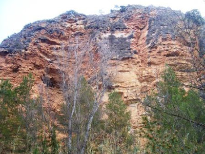 1’2km por su ribera llegamos a un desvío, seguido en pocas decenas de mts por otro, siguiendo ambos por la derecha y en 500 mts más podemos bajar hasta el mismo cauce del río, donde nos situaremos bajo la roja pared de la peña Atrón, en la que antiguamente albergaba una pareja de águilas, quedando indicios de aquello con el abandonado nido que veremos en una de las pequeñas repisas.