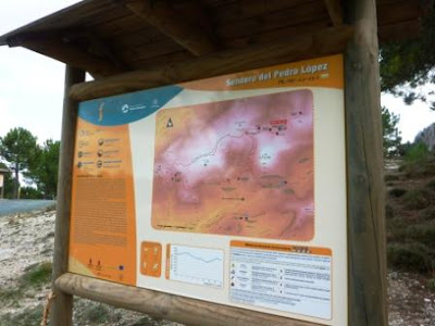 Para dirigirnos al comienzo de este paseo nos acercaremos con nuestro vehículo hasta el aparcamiento que encontraremos un par de km antes de culminar en el Morrón de Espuña, donde existe una base militar. Aquí, en el aparcamiento comienza una senda señalizada como PR-MU63 Sendero del Pedro López, un panel con información del sendero nos lo muestra.