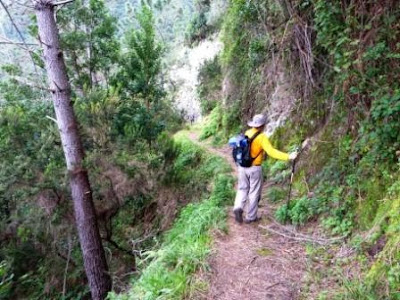 La senda, sin modo de perderse, puesto que no hay mas desvíos, pasa de la exuberante vegetación que oculta la altura por donde nos movemos, cruzando a veces estrechos barrancos que dejan caer pequeños saltos de agua, al paisaje abierto con una verticalidad que llama la atención. La senda en este tramo, queda totalmente desprotegida, disfrutemos del increíble entorno, pero con paso seguro.