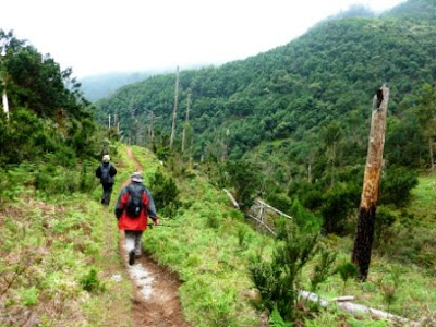 Se acercaba la tormenta, y justo al llegar al collado llamado Boca do Risco, lugar en el que comenzamos a separarnos de los altos cortados, para dirigirnos hacia Ribeira Seca, comienza a llover, aunque muy moderado, ya no nos abandonó hasta llegar a Ribeira Seca, donde en sus inmediaciones, coincidimos con un grupo de excursionistas que iban en la misma dirección.