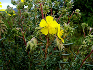 Es una planta leñosa, con los tallos erectos y llenos de un vello blanquecino, que le da a la planta un tono verde claro. Tiene las hojas alargadas y estrechas, recordándonos a las del romero. Las flores son de color amarillo.Es una mata que no suele pasar de los 50 ó 60cm y no desprende olor.