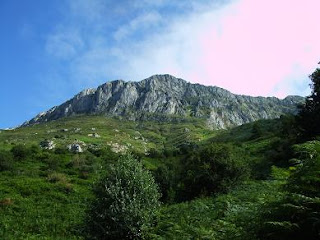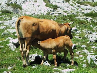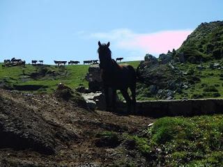 Rodeamos El Jurcueto por su izquierda hasta llegar a una fuente con abrevadero. Arriba vemos la Collada de Beza con bastante ganado pastando y terneros juguetones .